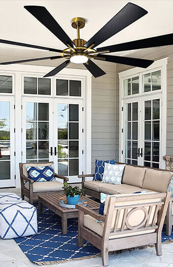 Weatherproof fan installation for patios, verandas and covered outdoor areas, built to withstand coastal conditions and provide cooling breezes.